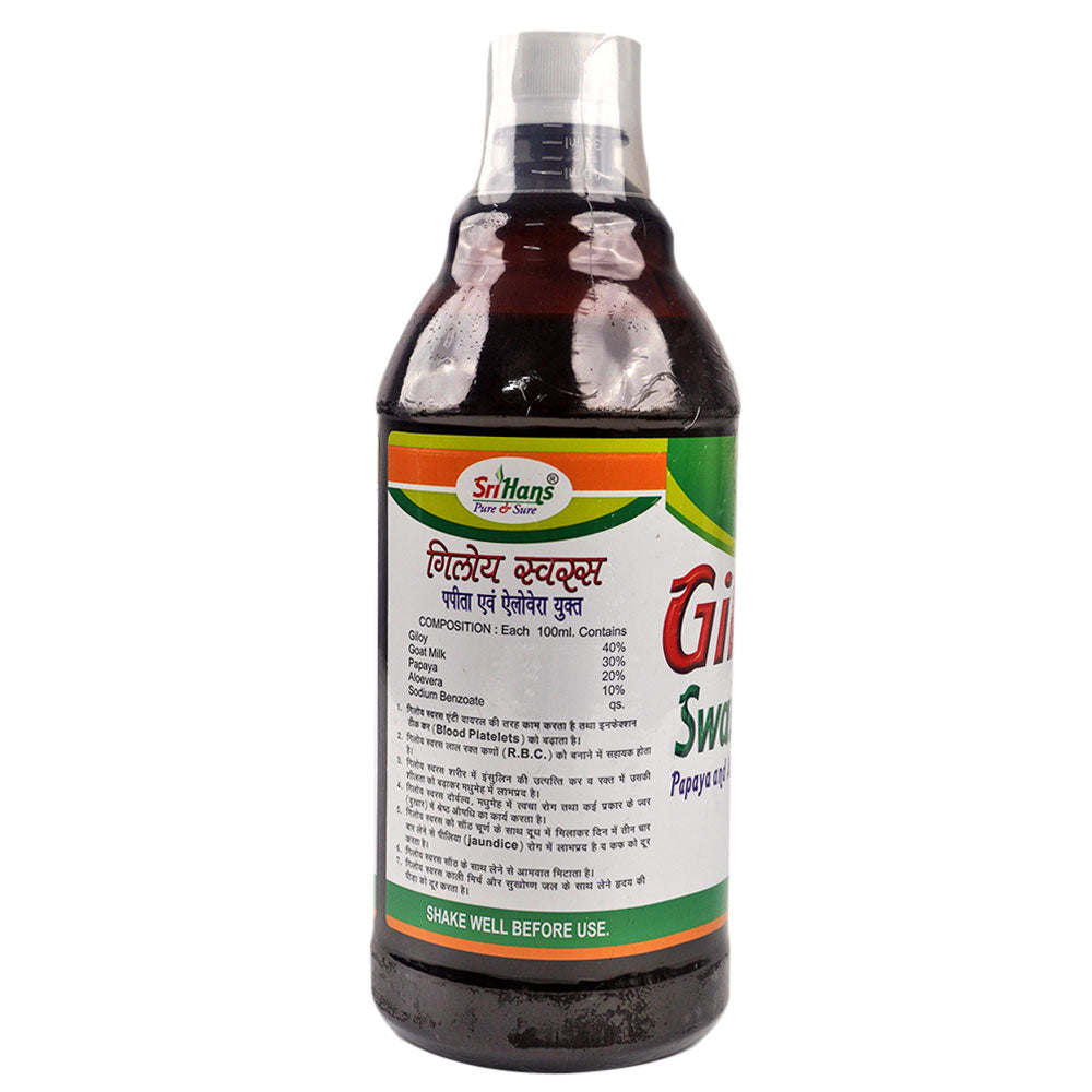 Sri Hans Giloy swaras is an ayurvedic preparation that acts as anti-viral on infections and increases blood platelets and is also helpful in increasing red blood cells (R.B.C) count. Since it contains goat milk and papaya, it is beneficial in jaundice.