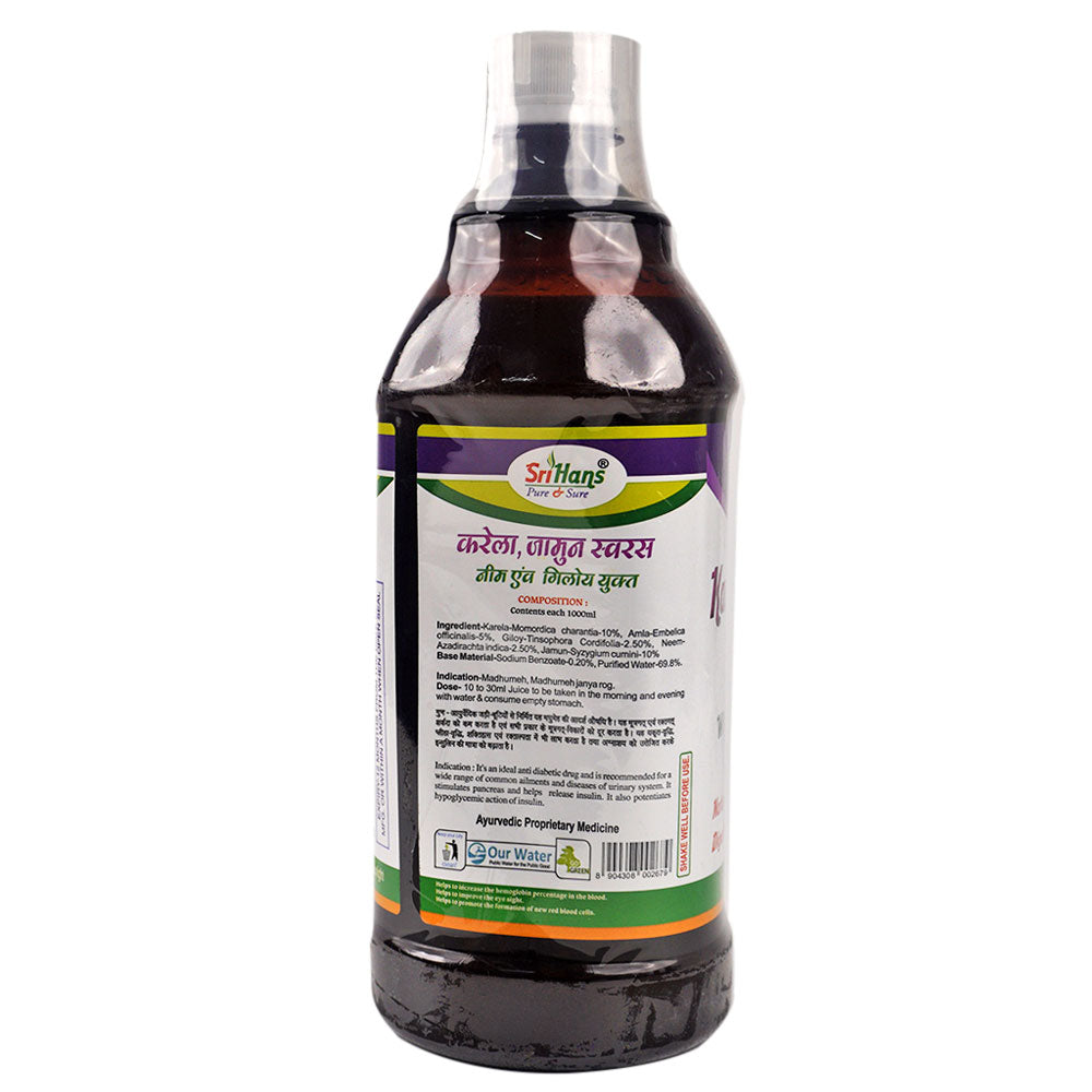 Sri Hans karela jamun swaras is a herbal combination of pure karela and jamun extracts which helps in preventing all types of diabetes and its after effects such as blurriness in eyes, weakness of bones, muscles tiredness, joint pain, deficiency of hemoglobin and blood and hypertension.